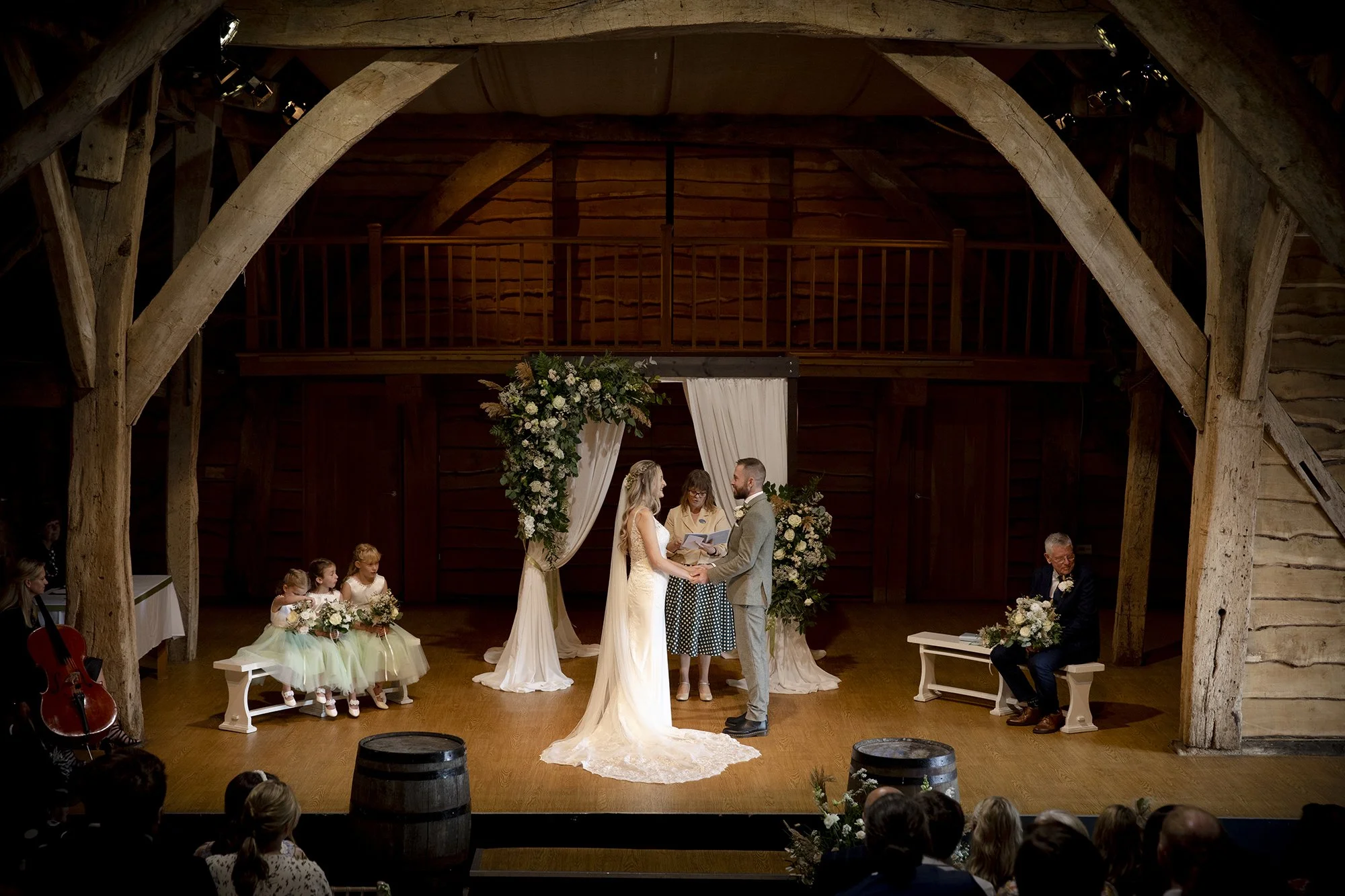 A wedding ceremony taking place in a rustic barn with a bride and groom holding hands, standing under a floral arch with white curtains. Three young flower girls are sitting on a bench on the left, holding flowers. An officiant is standing in front o