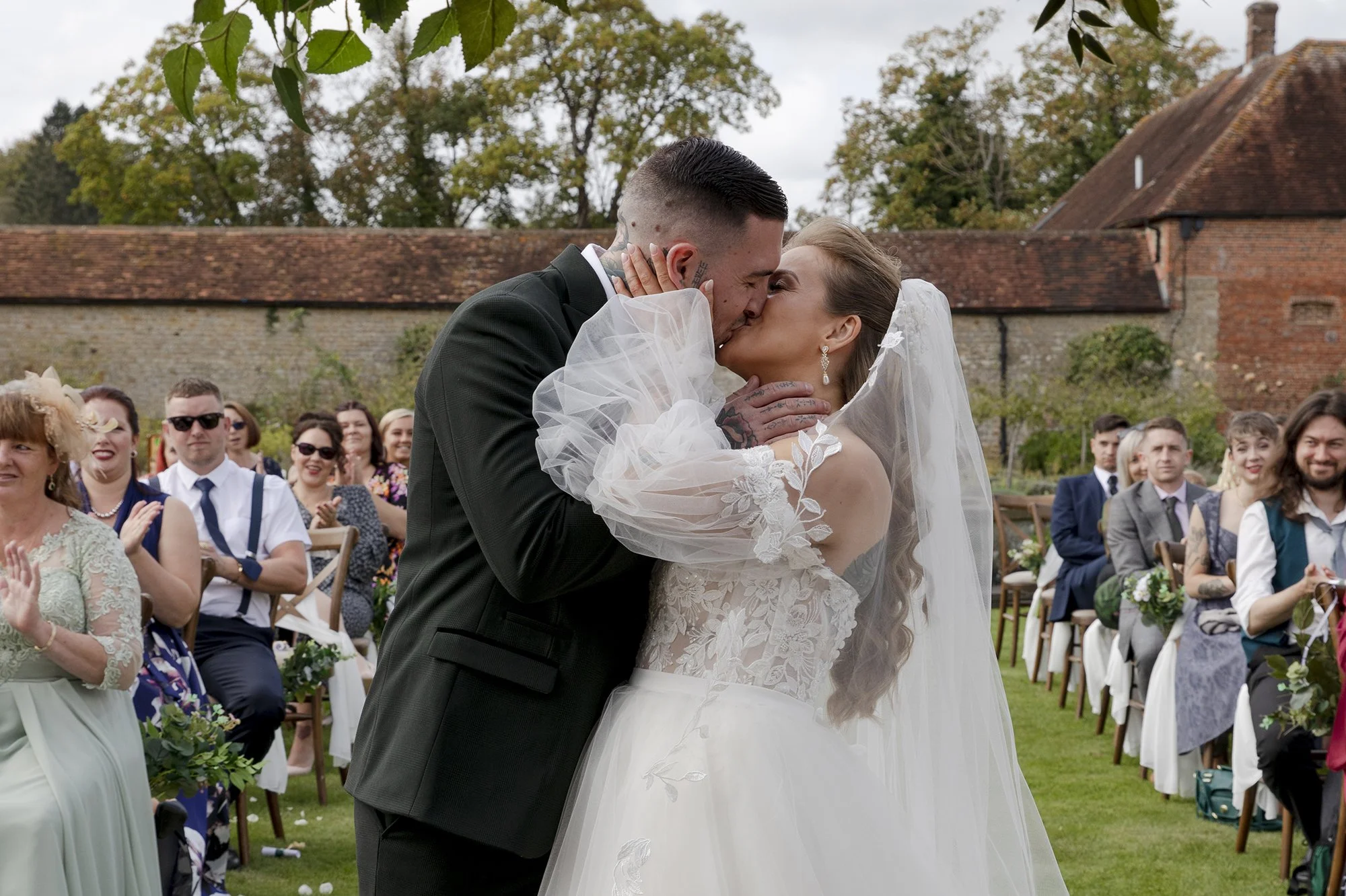 A bride and groom kiss during their wedding ceremony outdoors, surrounded by seated guests clapping and smiling on a grassy area with a brick wall and trees in the background.