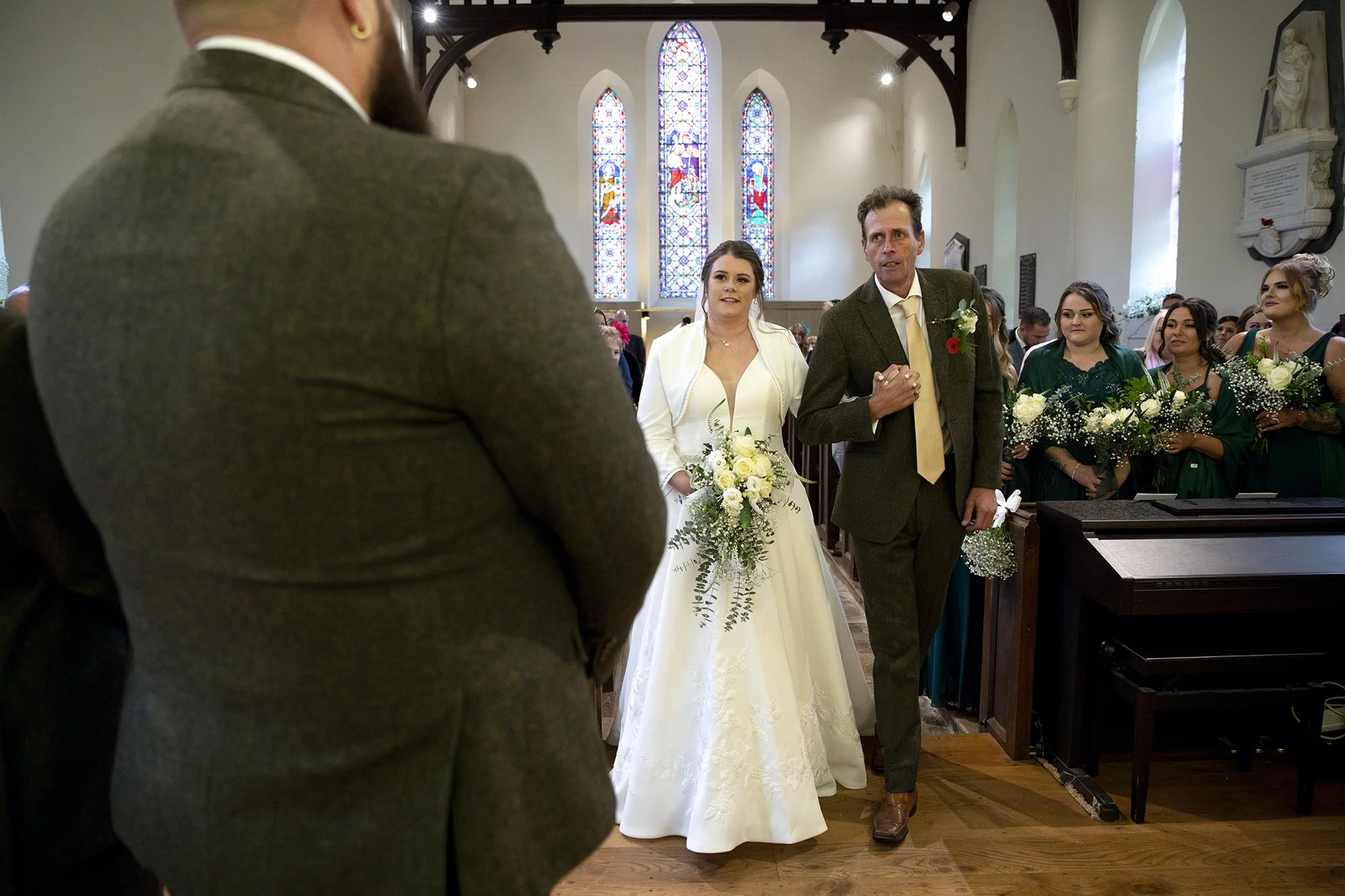 A bride walking down the aisle with her father at a church wedding, with bridesmaids standing in the background holding bouquets, stained glass windows visible in the church.