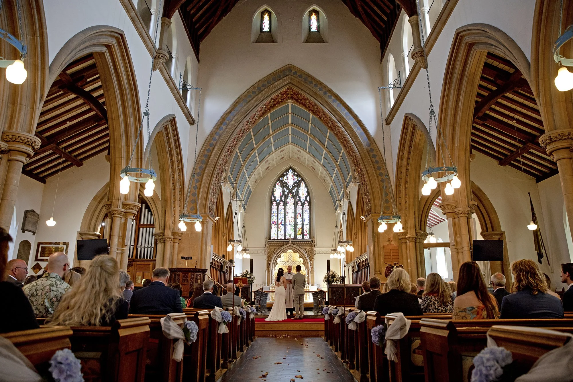 A wedding ceremony inside a church with arched wooden ceiling, stained glass window at the front, and guests seated on pews decorated with flowers.